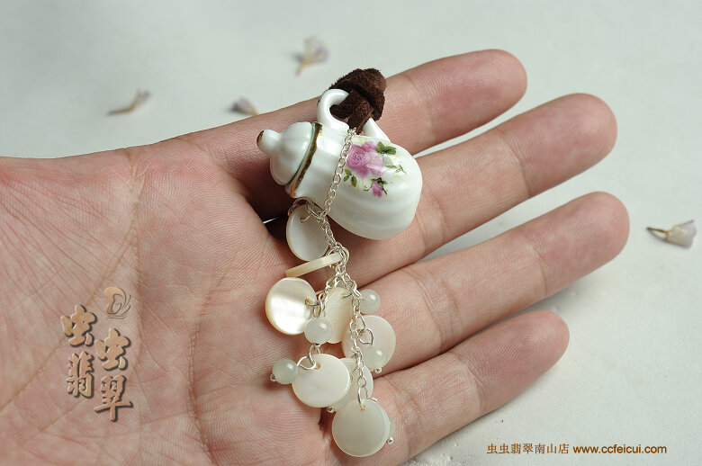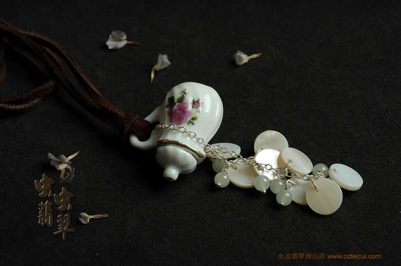 迷你的陶瓷小茶具,搭配冰化阳底的翡翠珠(5mm)和圆形贝壳。