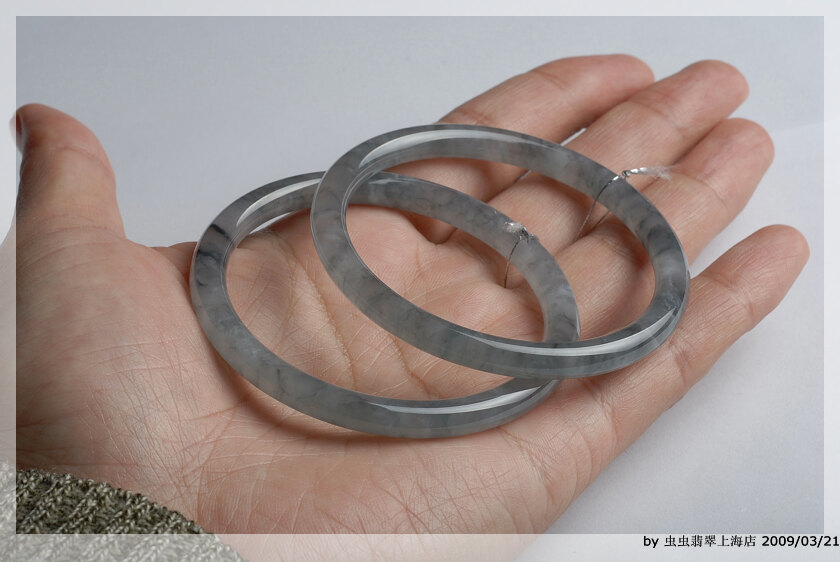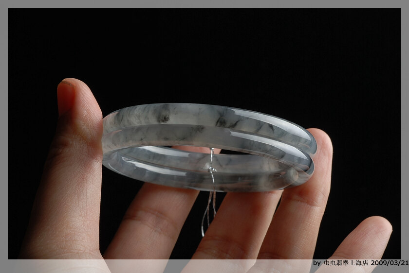 黑冰料子是我至今见过刚性最好的,可能这个跟它内含成分有关,这种硬度,随便一拉光就是镜子一样的光面,即使是大到66mm宽到21的宽镯子,那出来的声音也是刚刚的高音,脆生生的音频,老远都掩不住的直钻入耳。这种飘逸的墨黑的花色,丝雾状态如水墨画般,轻盈盈的,总是要忍不住透过光去研究了透彻~ 目前镯子全部取完,成品在三间实体里分别都有销售。