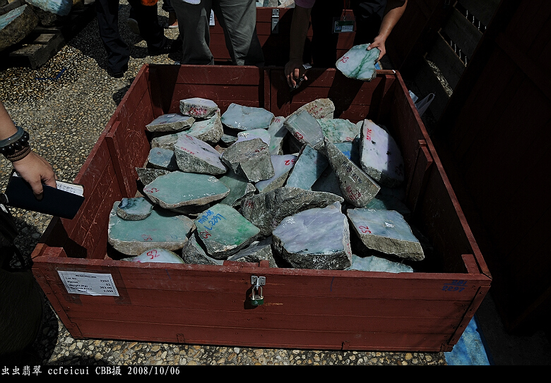 缅甸的公盘,有个最叫人郁闷的就是,份数大,有时候一筐子石头,你只是看中一两块而已,但是别处又没有,只好把一份都吃下来~`