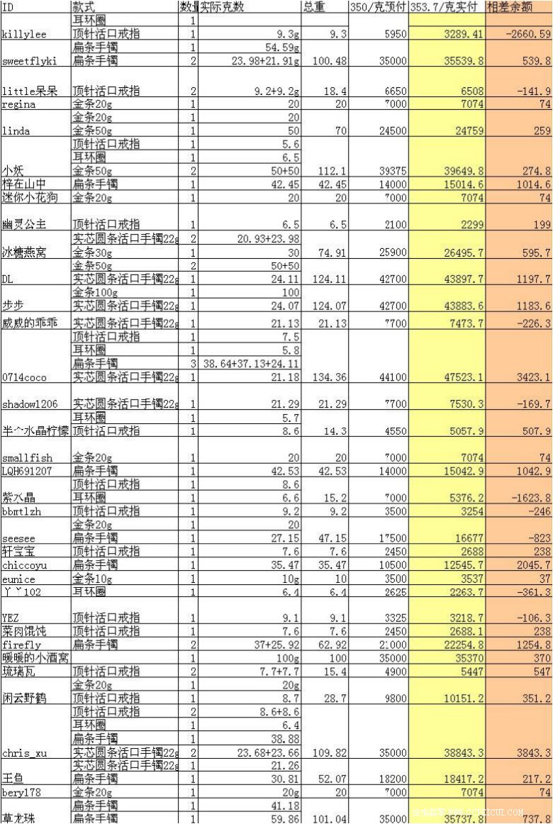 下图是各位的实际购买重量、预付哦、应付额、差额。