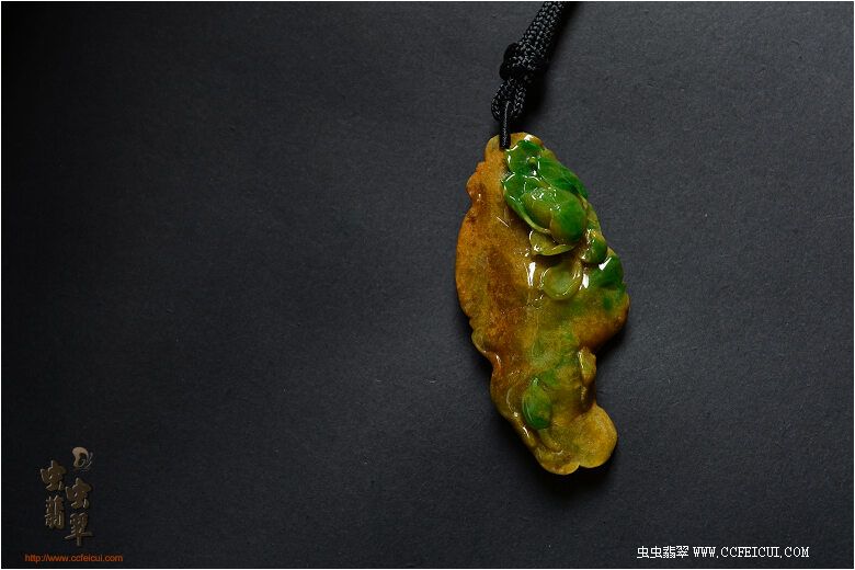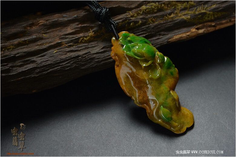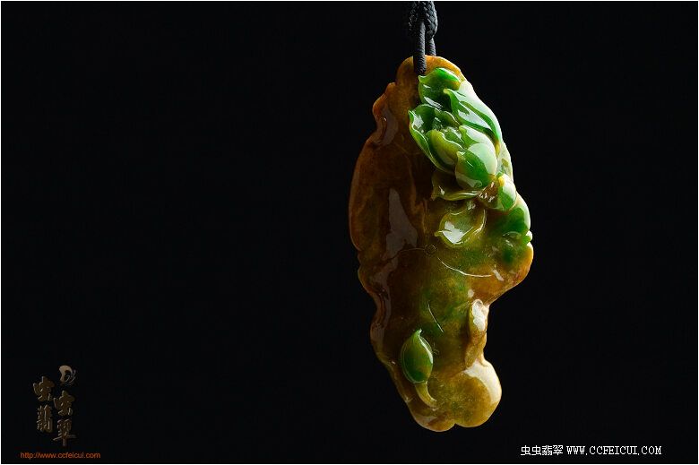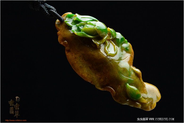 料子是非常老种的达马坎黄加绿水石,设计师随型设计了莲叶和荷花,这正好暗扣主人的虫网名字