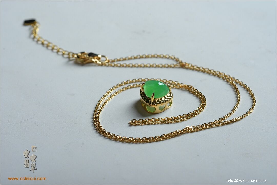 商品名称:甜甜[阳绿心形翡翠K黄吊坠项链]镶嵌定制