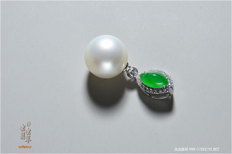 商品名称:小麻雀【G18K白金伴钻镶嵌翡翠绿团团随型+珍珠吊坠】镶嵌定制