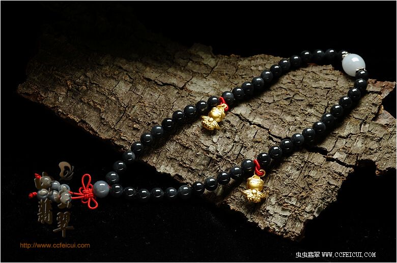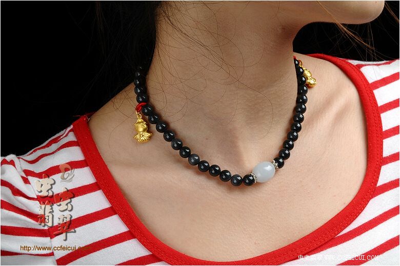 商品名称:53-黑森林料翡翠圆珠千足金手链项链(已售)