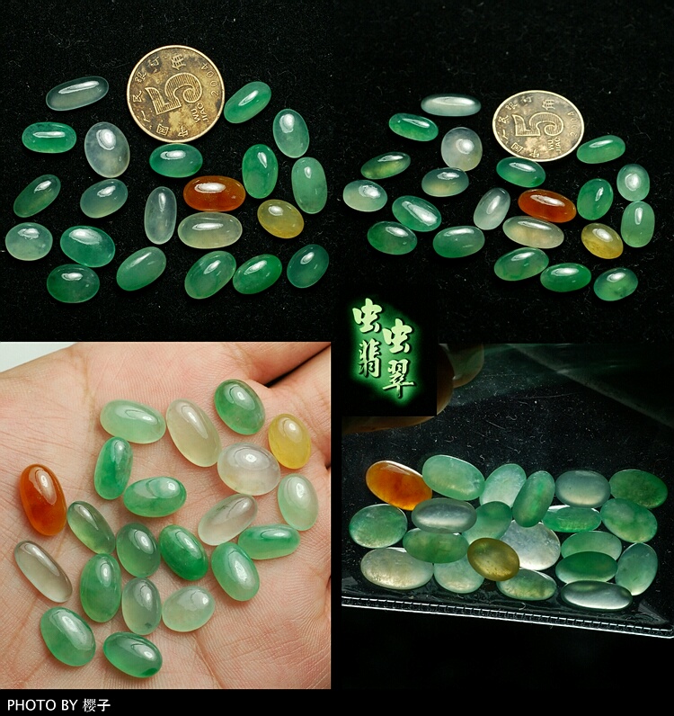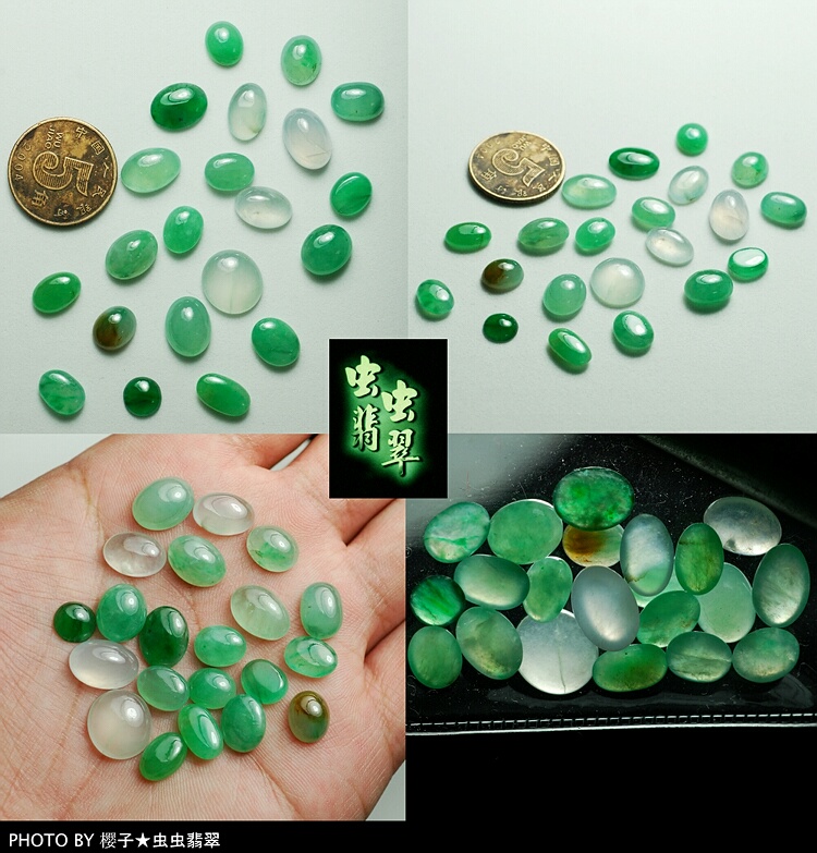 第三手是满绿大蛋面(已售)最小的规格:10.39×7.29×4.09mm最大的规格:13.23×9.85×4.60mm大小规格比较近似~`有几颗可做男戒~`全绿色~``有豆绿和翠绿```豆种、糯种、化地~```
