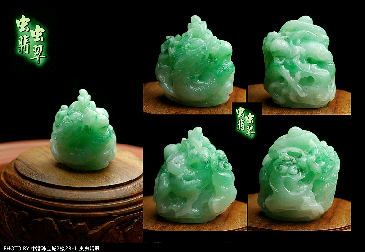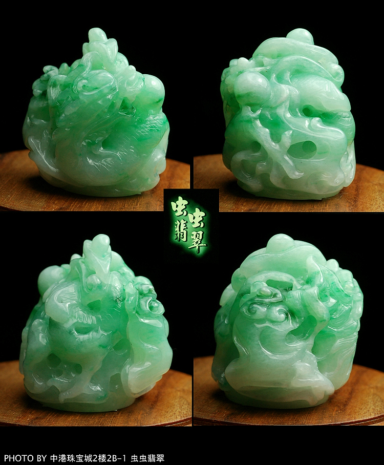立体、镂空、深浮雕刻工艺,飞龙环绕呈圆球柱状。 色阳翠,种细,肉眼不可见颗粒结构。