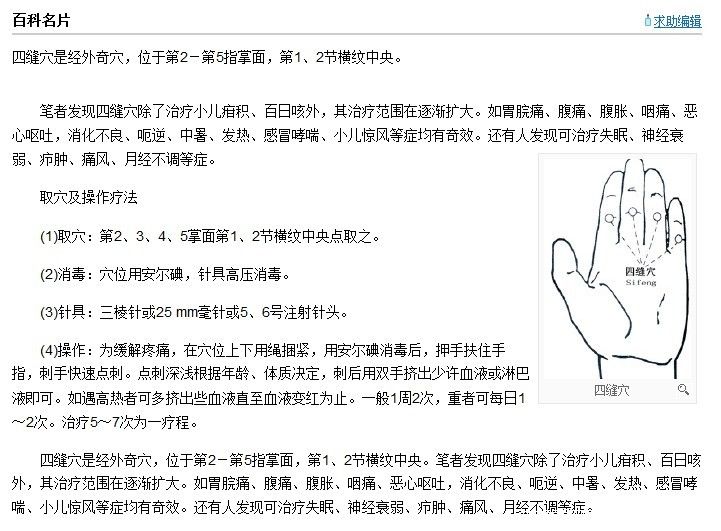 标题:[分享]我爱中医之儿童常见病护理小技巧--104楼添加四缝穴治疗小儿疳积 |