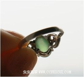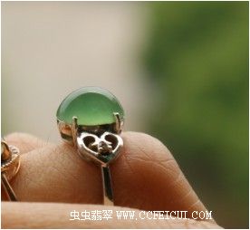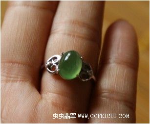 2010年初买的戒面镶嵌的。裸石尺寸:9.4*7*5.5,原卖家描述:冰种起荧光,绿水,内部有棉上手不显,主要在底部,另外就是形状上一边有些塔形。戒圈尺寸为11号的,18K白镶嵌的,用了两颗2分小钻。图片拍摄很详尽。